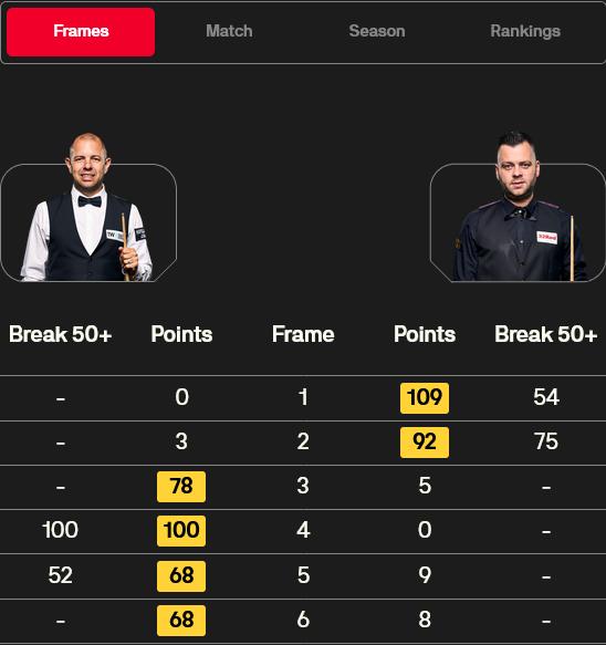 第五时段中,6号种子卢卡-布雷切尔与英格兰选手安东尼-汉密尔顿打满7局。比赛中,汉密尔顿先胜两局后,“比利时枪弹”凭借3杆60+,大比分3-2反超,最先拿到赛点。英格兰东谈主援助赛点。决胜局中,布雷切尔再胜一局,大比分4-3告捷,晋级正赛第二轮。