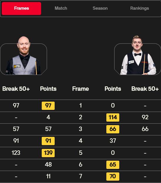 第四时段中,14号种子约翰-希金斯对阵英格兰选手安德鲁-希金森。比赛中,“巫师”先下一城后,希金森打出单杆66分,扳回一局。但尔后,苏格兰东谈主打出1杆90+,连胜三局,大比分4-1晋级正赛32强,他也成为“75三杰”中,独一闯过正赛首轮关的。